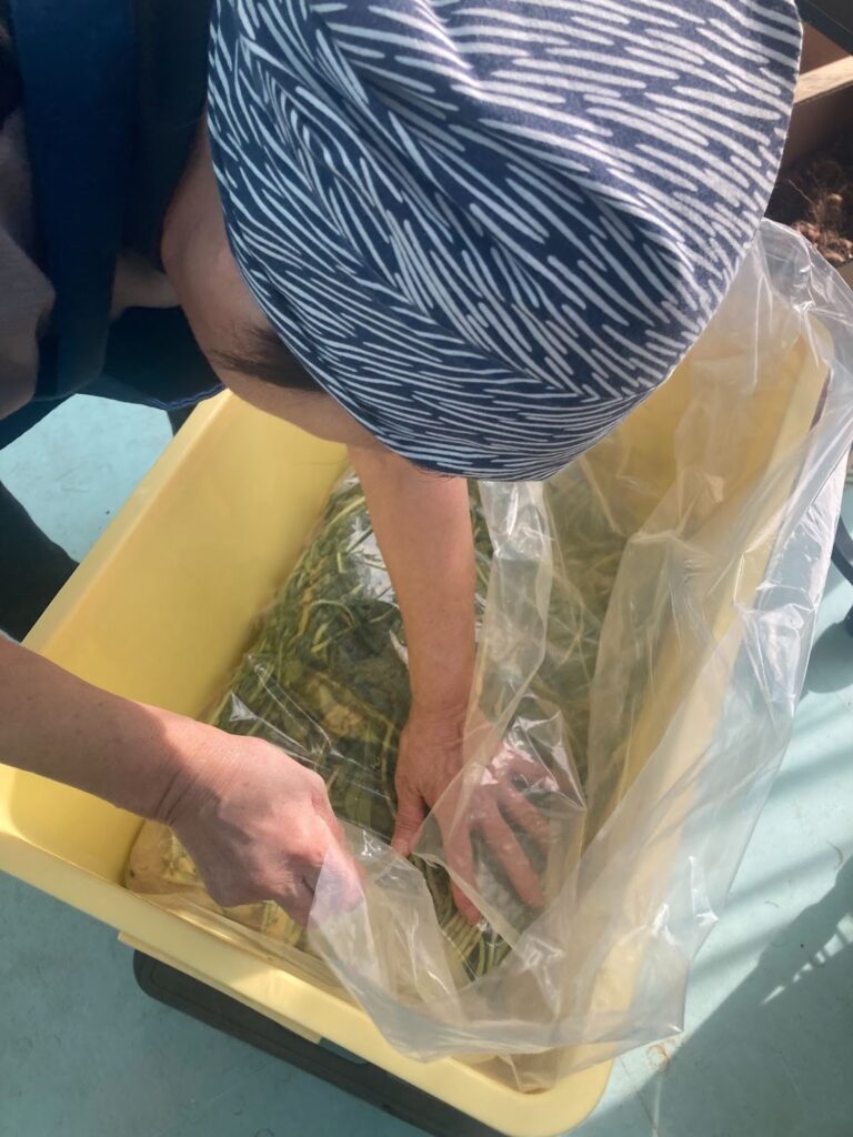 最後に大根の葉をかぶせてしっかり袋の口を閉じ重石を乗せます。重石が甘いと水が上がってこないので、最初は重石を多めにし、水があがったら少し軽くしてあげます。
