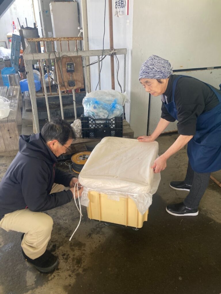 樽をピロティにおろし、天然の冷蔵庫で保存です。今年は風がびゅうびゅう吹く中作業している私たちを見かねて、農舞台の石口さんが手伝ってくれました。