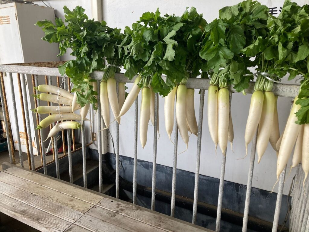 今年は,毎年沢庵漬け用の大根を干してくださる農家さんが秋に大怪我をしてしまい、大根を干すところから自前ですることになりました。地元の方が干す様子を観察したり、お話を伺ったりして上手くいくか不安な中作業しました。