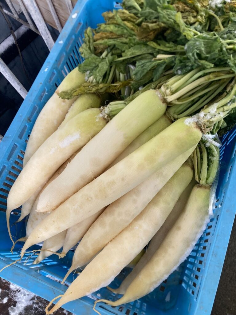 干しあがりを地元に方に聞いたところ、大根を横に持ってしなっとなったらOKということだったのですが、なかなか水分が飛ばず、ずるずると干していたら寒さで凍みてしまいました。(あーー)