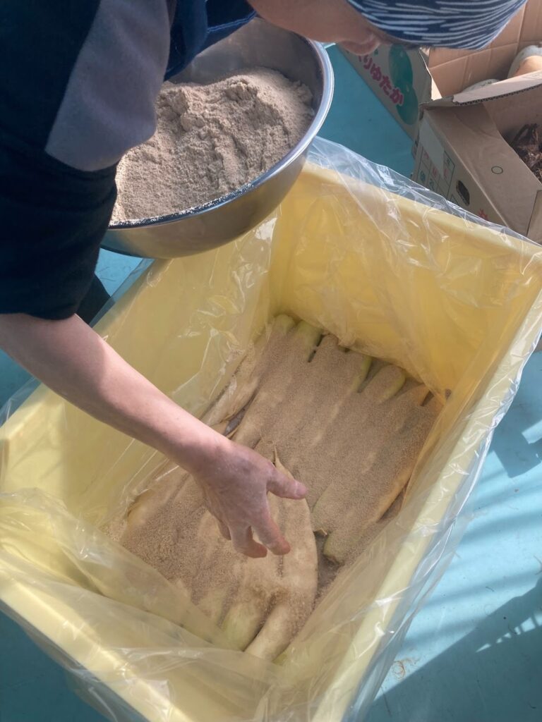 近所の精米所から分けてもらった小糠と塩、少しの沢庵漬けの素をいれたシンプルな配合。すべてをボールで混ぜて並べた大根の上に撒いていきます。